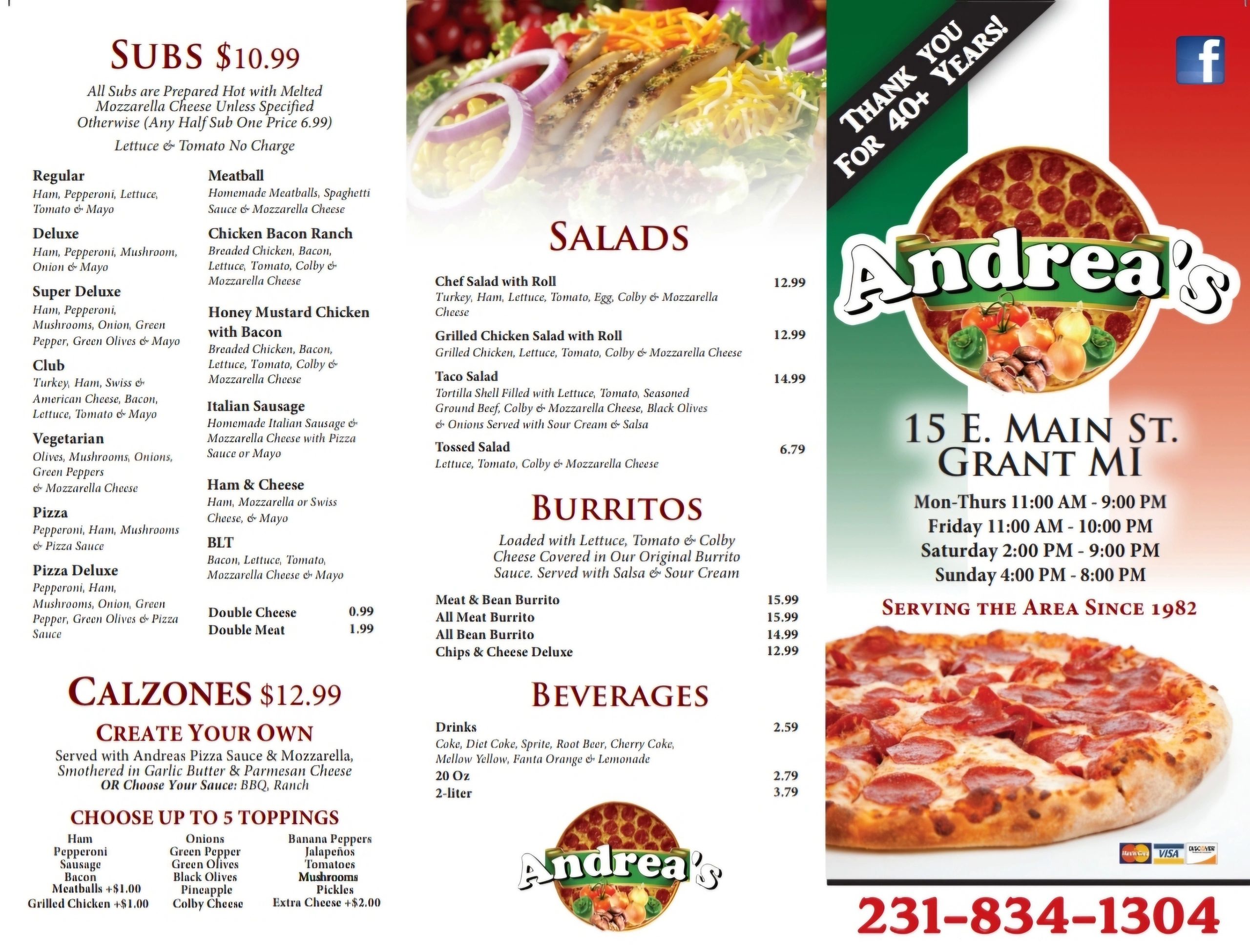 Andreas Pizza & Italian Restaurant NEWAYGO COUNTY'S LONGEST RUNNING PIZZA PLACE, located at 15 E Main St Grant, MI 49327. Started by Dominic Barone & Family have been serving the SAME ORIGINAL Italian Recipes since 1982 in the same location. PIZZA, PASTA, SUBS, BURRITOS & More for over 40+ years...