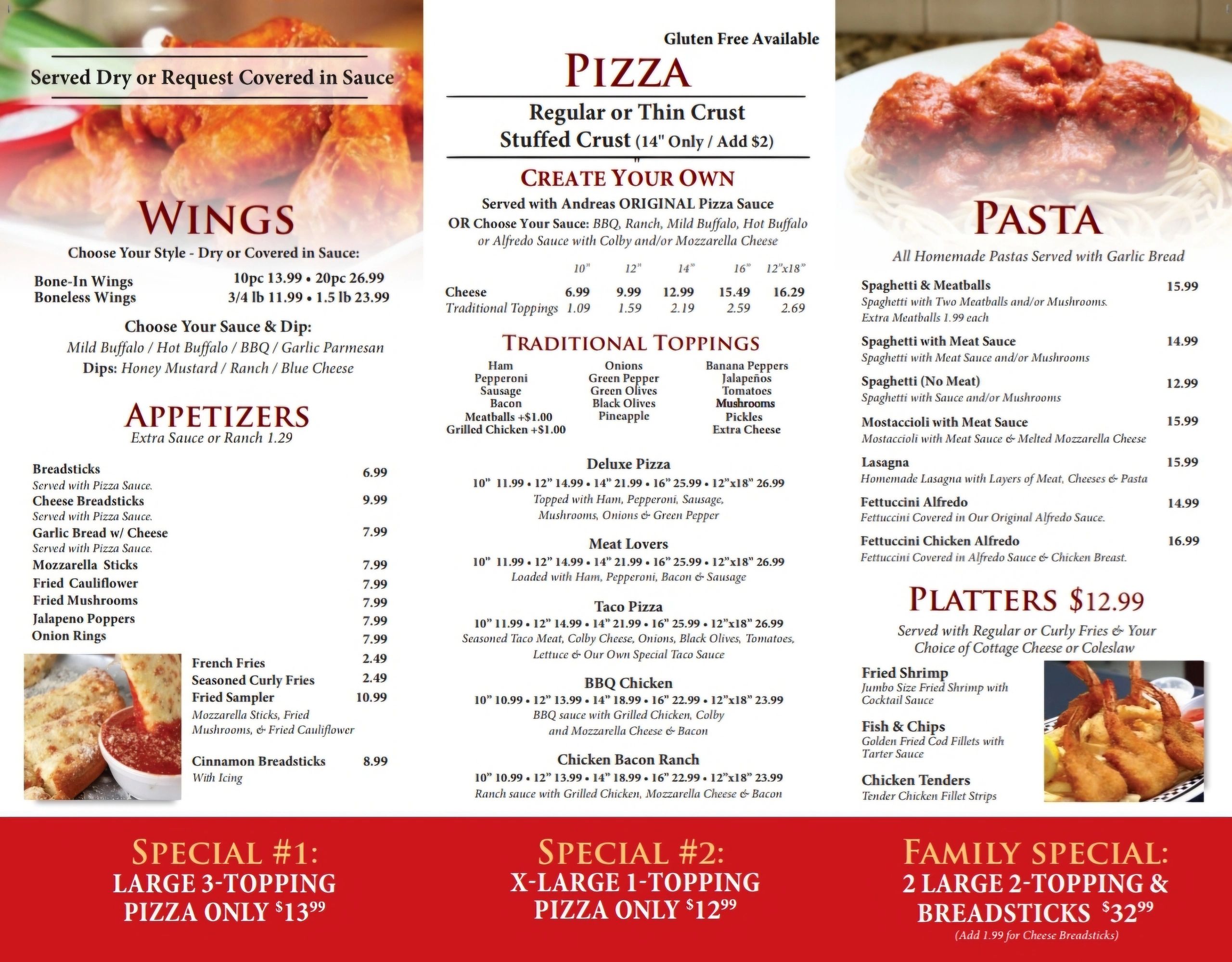 We offer a variety of pizza including 12x18 Sicilian, thin crust, traditional & gluten free.